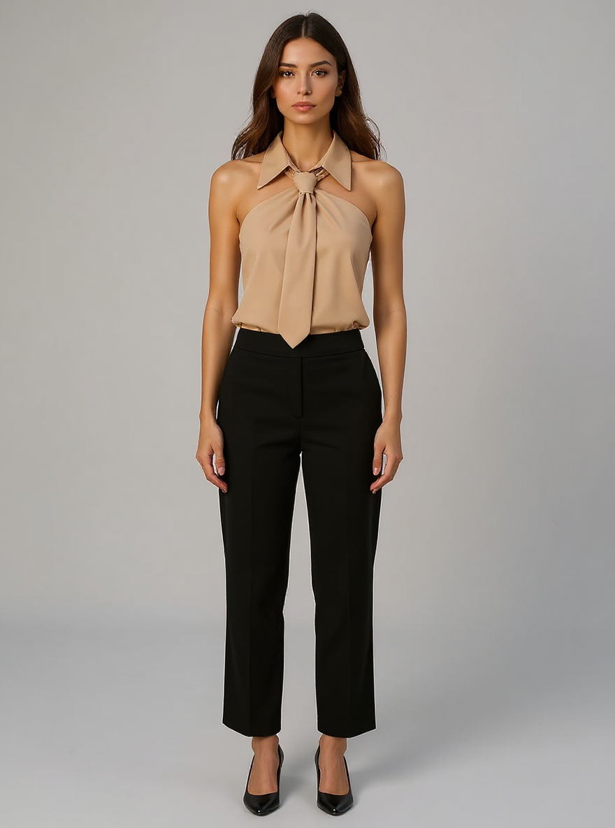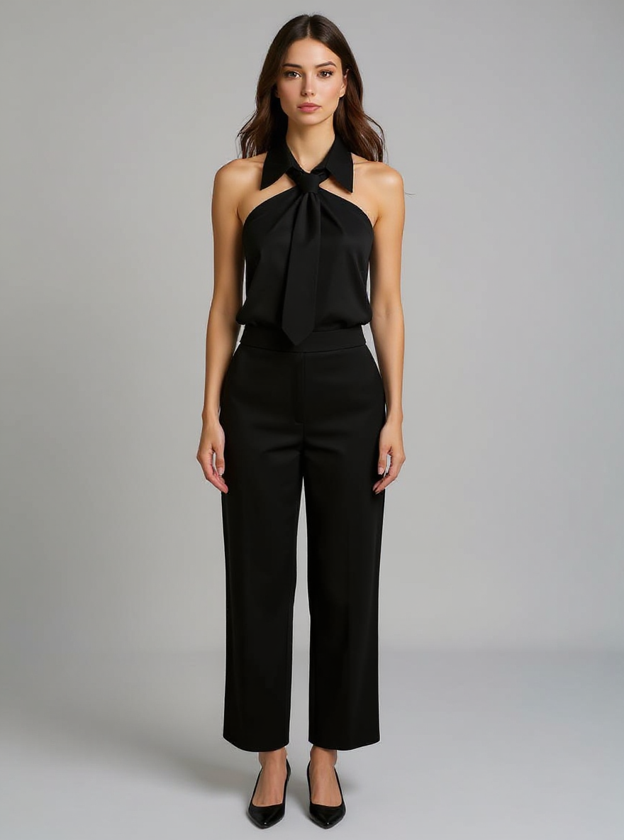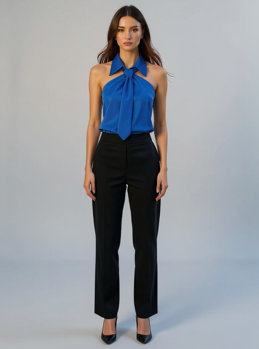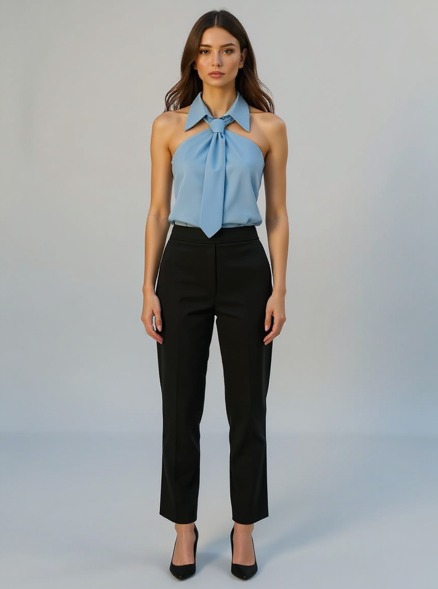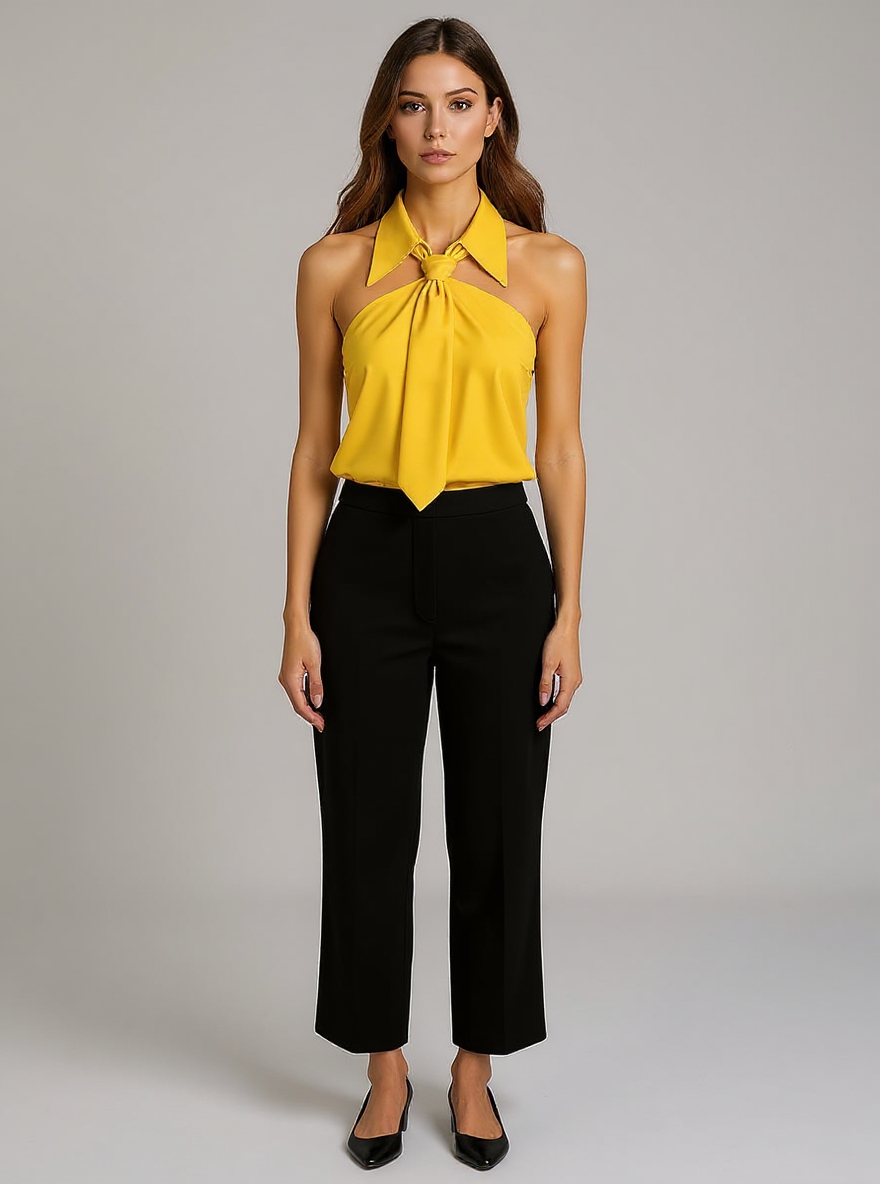 This sleeveless halter blouse blends comfort with a polished silhouette, crafted from a durable blended fabric that feels soft on the skin. Featuring a built-in neck tie and a structured collar, it adds a refined touch to your ensemble. Designed to drape loosely, it flatters various body shapes while maintaining a neat appearance. Ideal for casual outings, office settings, or holiday gatherings, it transitions effortlessly from day to night. Its versatile design makes it a practical choice for updating your holiday clothes collection.