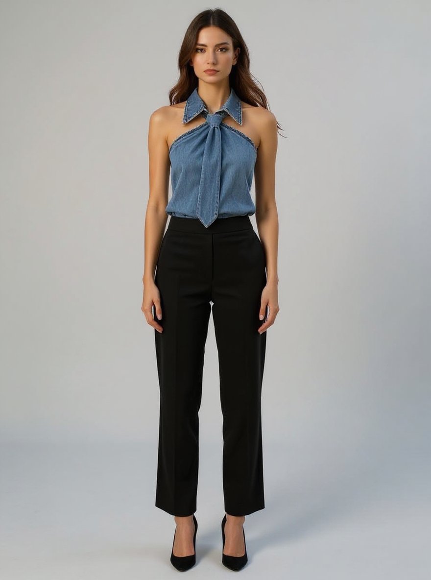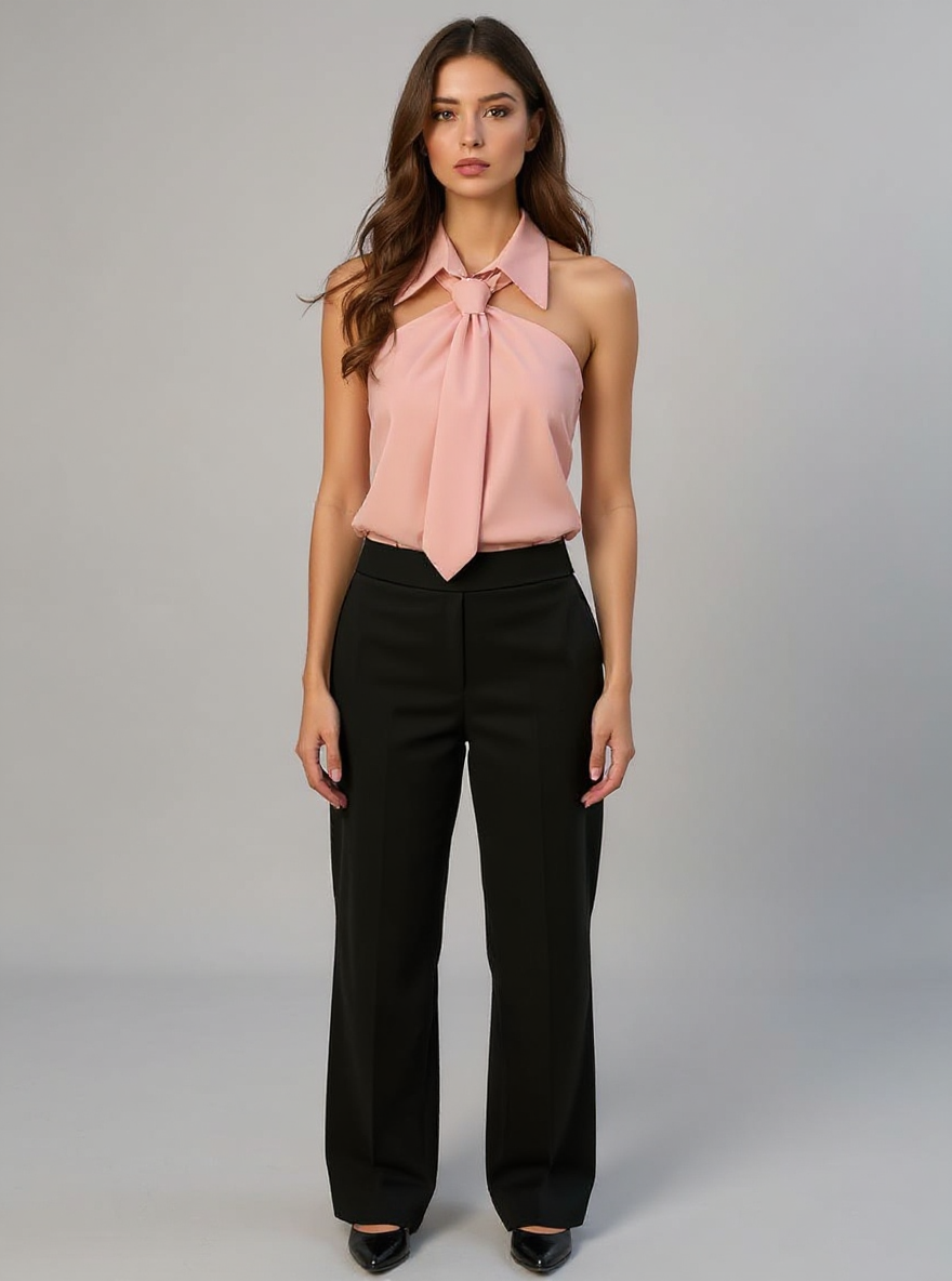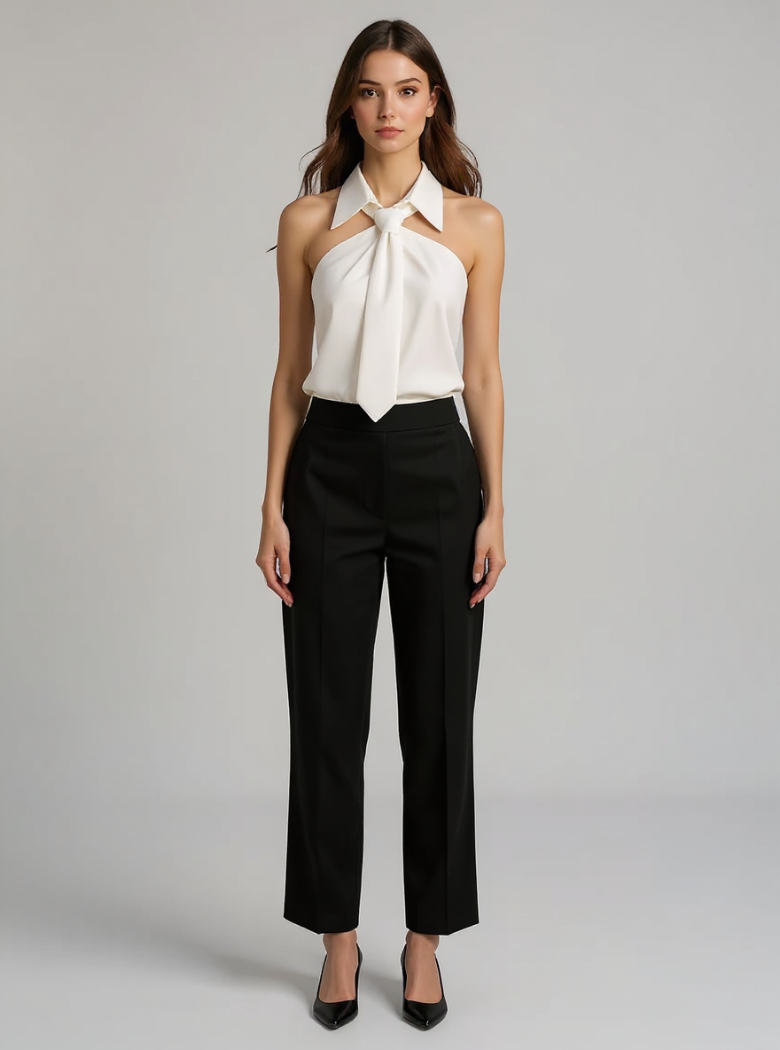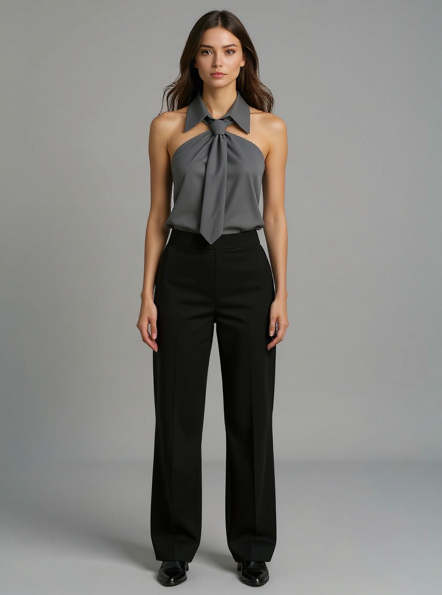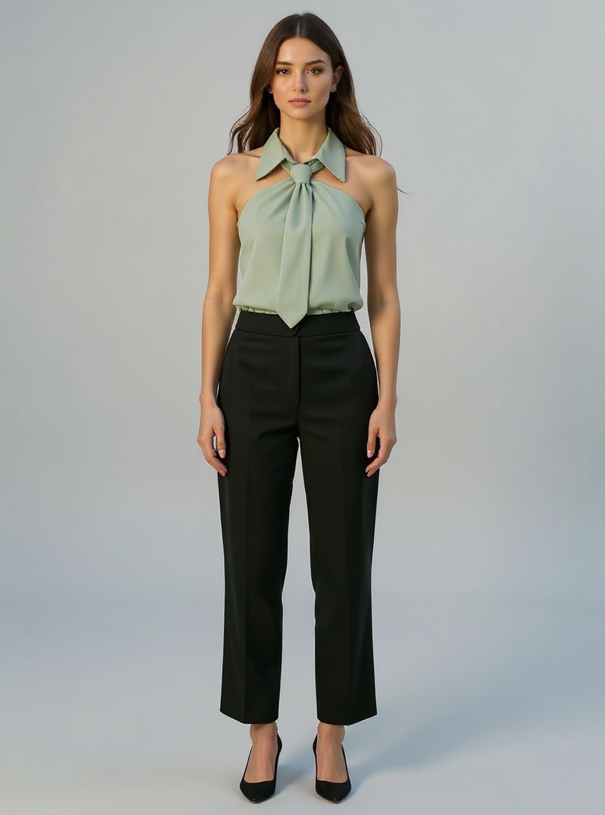 This sleeveless halter blouse blends comfort with a polished silhouette, crafted from a durable blended fabric that feels soft on the skin. Featuring a built-in neck tie and a structured collar, it adds a refined touch to your ensemble. Designed to drape loosely, it flatters various body shapes while maintaining a neat appearance. Ideal for casual outings, office settings, or holiday gatherings, it transitions effortlessly from day to night. Its versatile design makes it a practical choice for updating your holiday clothes collection.