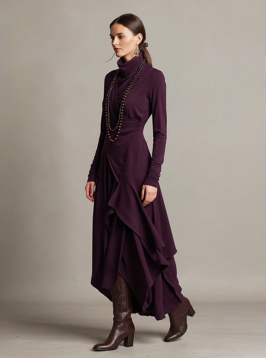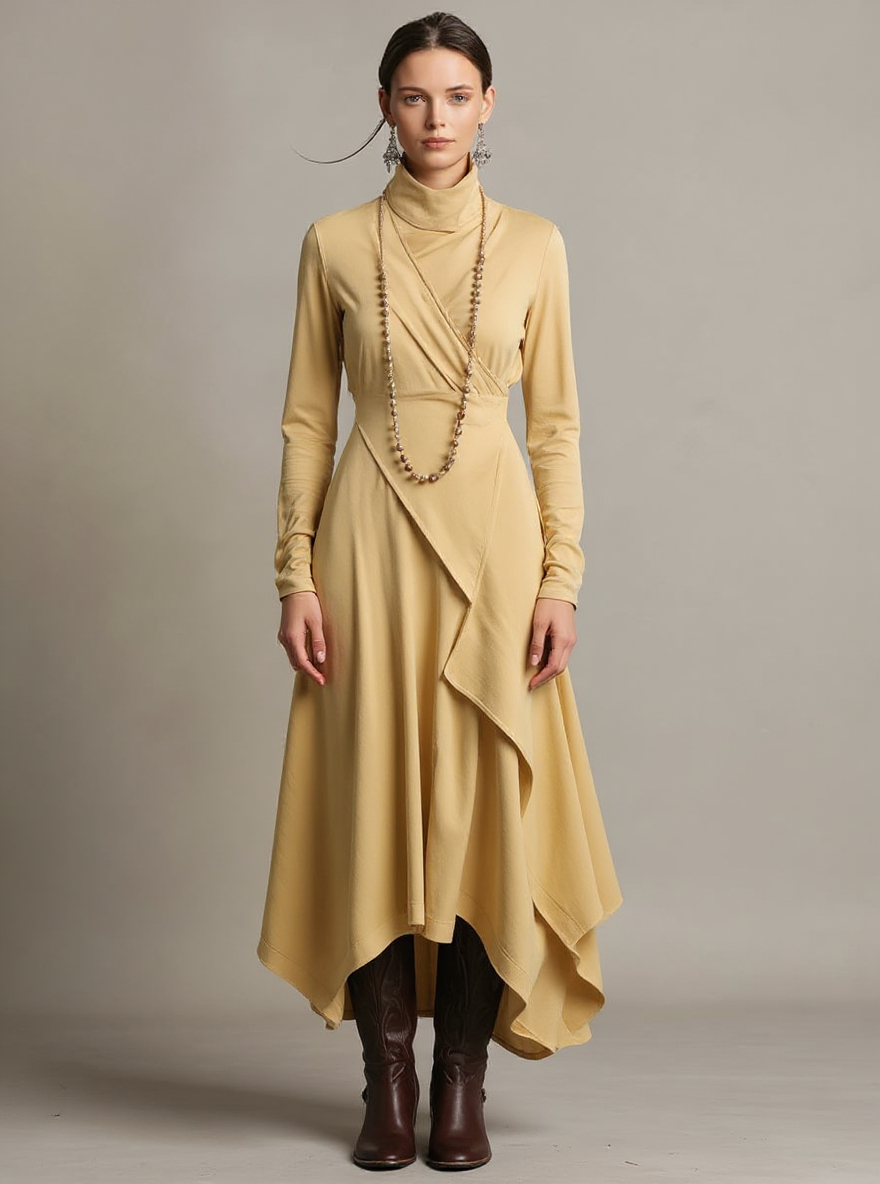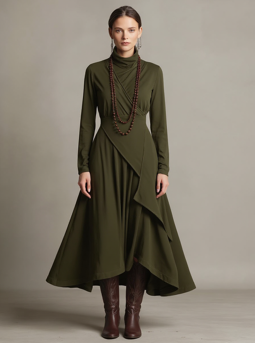 Experience effortless elegance with this cotton maxi dress designed for comfort and style. Featuring a soft turtleneck and unique asymmetric draping, it offers a relaxed yet refined silhouette. Ideal for wedding guests, casual gatherings, or semi-formal events, its breathable fabric keeps you comfortable throughout the day. The maxi length and bohemian vibe add a touch of grace, making this dress suitable for all seasons. Versatile enough to transition from day to night occasions, it stands out with its distinctive design.